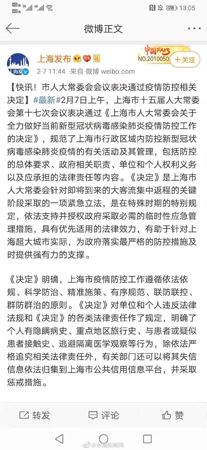 2月7日,上海市十五届人大常委会第十七次会议表决通过《上海市人大常委会关于全力做好当前新型冠状病毒感染肺炎疫情防控工作的决定》,《决定》明确了个人有隐瞒病史、重点地区旅行史、与患者或疑似患者接触史、逃避隔离医学观察等行为,除依法严格追究相关法律责任外,有关部门还可以将其失信信息依法归集到上海市公共信用信息平台,并采取惩戒措施。