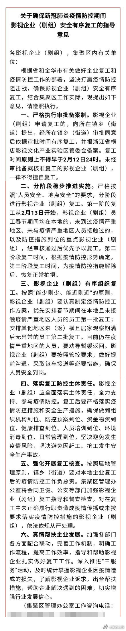 横店影视城发布复工指导意见:复工时间原则上不得早于2月12日24时